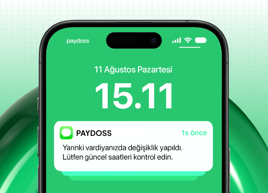 Paydoss, mobil bildirimlere ek olarak SMS bildirim desteği de sunar. SMS bildirimleriniz için ileri tarihli gönderim tanımlayabilir, duyurularınızın belirlediğiniz gün ve saatte otomatik olarak iletilmesini sağlayabilirsiniz. Böylece iletişiminizi planlı bir şekilde yönetir, kritik bilgilendirmelerin doğru zamanda iletilmesini sağlarsınız.